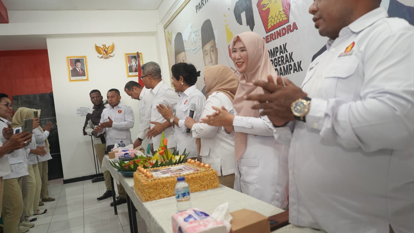 HUT Ke 18 Partai Gerindra ditandai dengan pemotongan tumpeng dan kue ulang sebagai simbol rasa syukur atas perjalanan panjang partai.