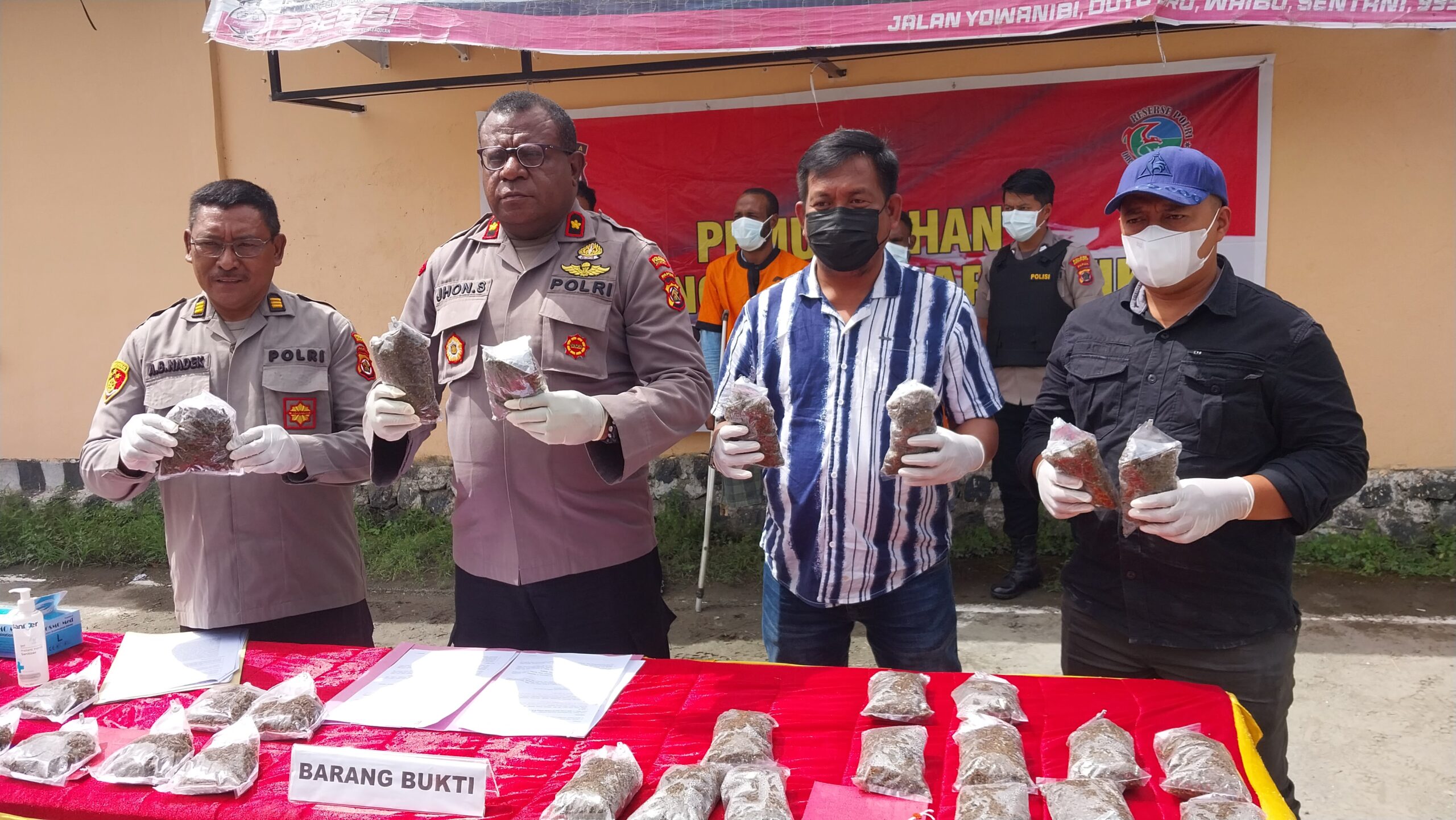 Wakapolres Jayapura Kompol Joni Samonsabra, SH., MH didampingi Kasat Narkoba AKP Alfrit B. Nadek, SH bersama Kejaksaan Negeri Jayapura Oktovianus Talitti, SH dan Mohammad Arifin, SH dengan disaksikan langsung kedua tersangka berinisial BK (22) dan MW (35), memusnahkan barang bukti ganja yang dibakar, didapat dari kedua tersangka tersebut dengan berat total 1.531,30 (seribu lima ratus tiga puluh satu koma tiga puluh gram).