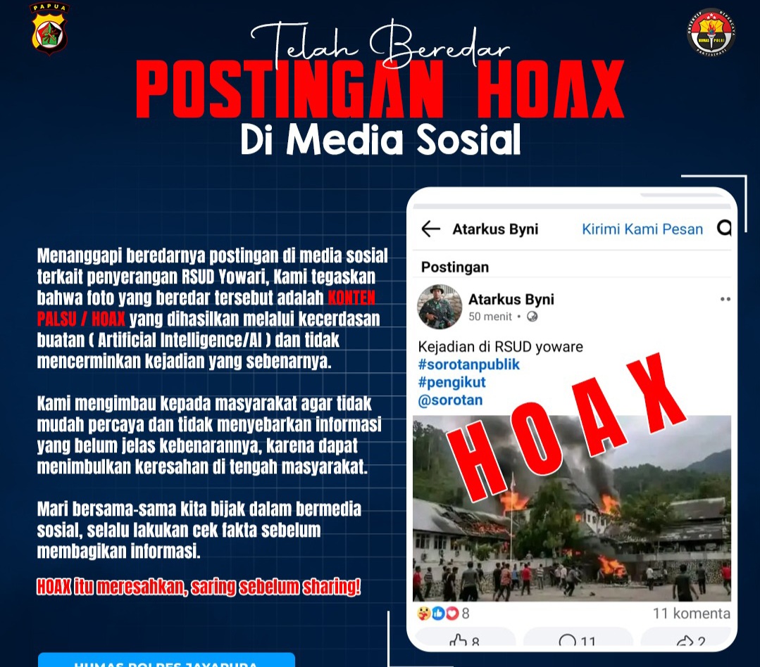 “Kami pastikan bahwa foto dan informasi yang menyebut RSUD Yowari dibakar atau diserang adalah hoax. Gambar tersebut merupakan hasil rekayasa AI yang sengaja disebarkan untuk menimbulkan kepanikan dan memperkeruh situasi,” tegas Kapolres.
