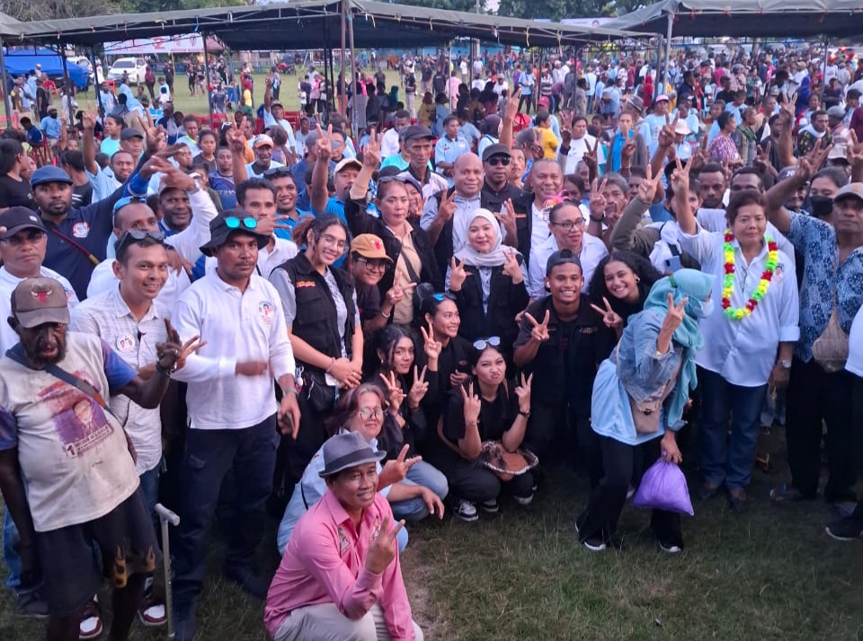 SARMI,Jelajahpapua.com – Seribuan massa pendukung pasangan Calon Gubernur dan Wakil Gubernur Papua nomor urut 2, Matius Fakhiri – Aryoko Rumaropen (Mari-Yo) dan pasangan Calon Bupati dan Wakil Bupati Kabupaten Sarmi nomor urut 2, Yanni – Jemmi Esau Maban memadati lapangan Merdeka, Kabupaten Sarmi, Papua, dalam rangka kampanye terbatas Pilkada serentak 2024, Selasa (12/11/2024).